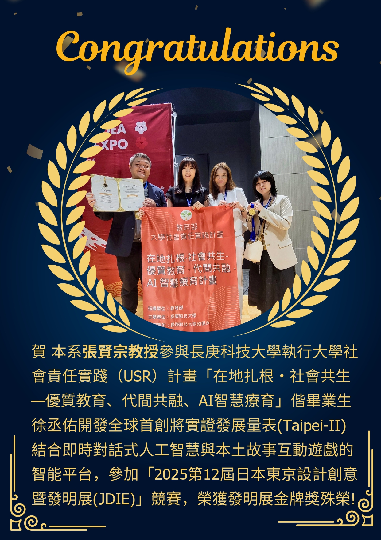 🎉 Congratulations! Prof. Chang Hsien-Tsung from the Department of Artificial Intelligence, together with graduate Hsu Cheng-Yu, has won the Gold Medal at the 2025 12th Japan Tokyo Design & Invention Expo (JDIE)! 🎖️