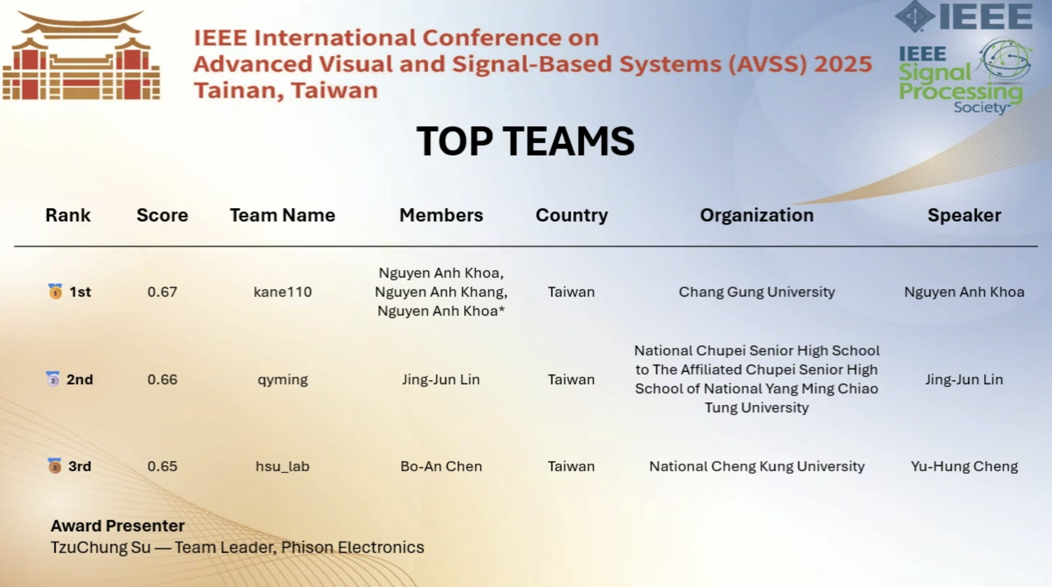 In August 2025, during the IEEE International Conference on Advanced Visual and Signal-Based Systems (AVSS) held in Tainan, master’s student Nguyen Anh Khoa and his team kane110 participated in the Taiwan AI Safety Challenge. With their solid expertise and innovative technical solutions, they stood out among many outstanding teams and claimed First Place with an impressive score of 0.67.