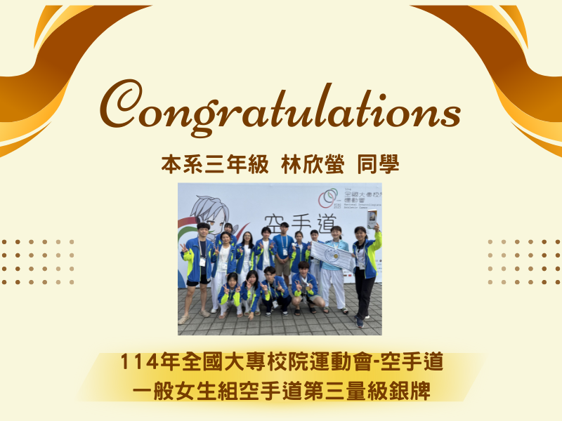 賀!本系 林欣螢同學 參加「114年全國大專校院運動會-空手道」 榮獲一般女生組空手道第三量級銀牌