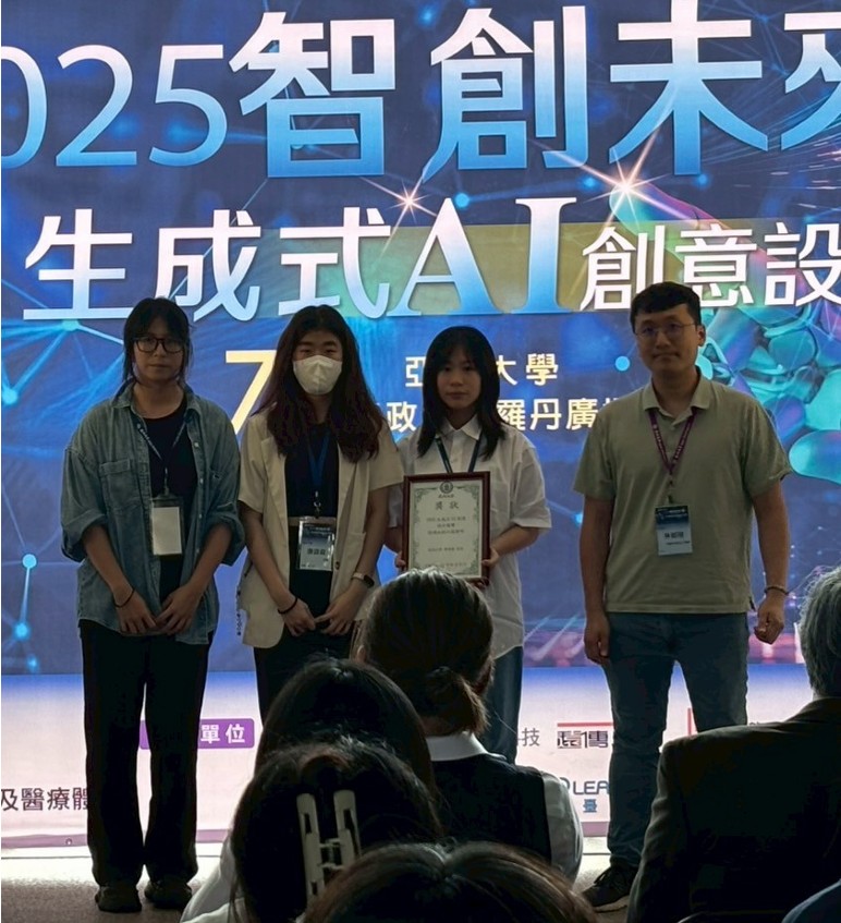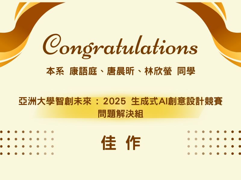 賀!本系 康語庭、唐晨昕、林欣螢同學 參加「亞洲大學智創未來 : 2025 生成式AI創意設計競賽」 榮獲問題解決組 佳作