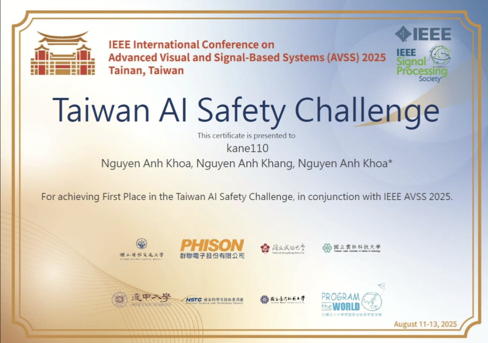在 2025 年 8 月於台南舉辦的 IEEE International Conference on Advanced Visual and Signal-Based Systems (AVSS) 中,本系碩士班 Nguyen Anh Khoa 同學與團隊 kane110 參加 Taiwan AI Safety Challenge,憑藉紮實的專業知識與創新的技術方案,成功從眾多優秀隊伍中脫穎而出,以 0.67 的高分勇奪 第一名 殊榮。