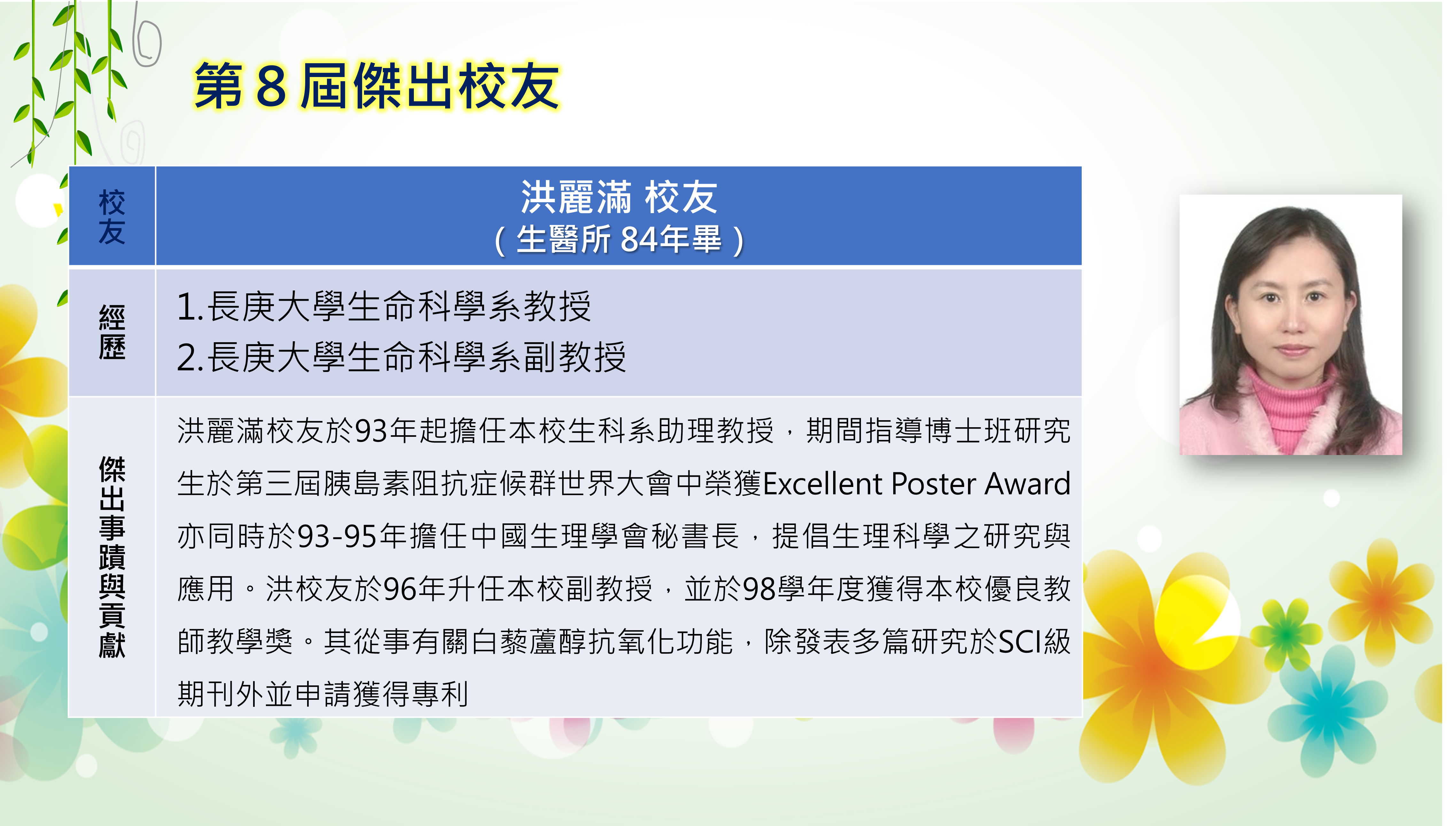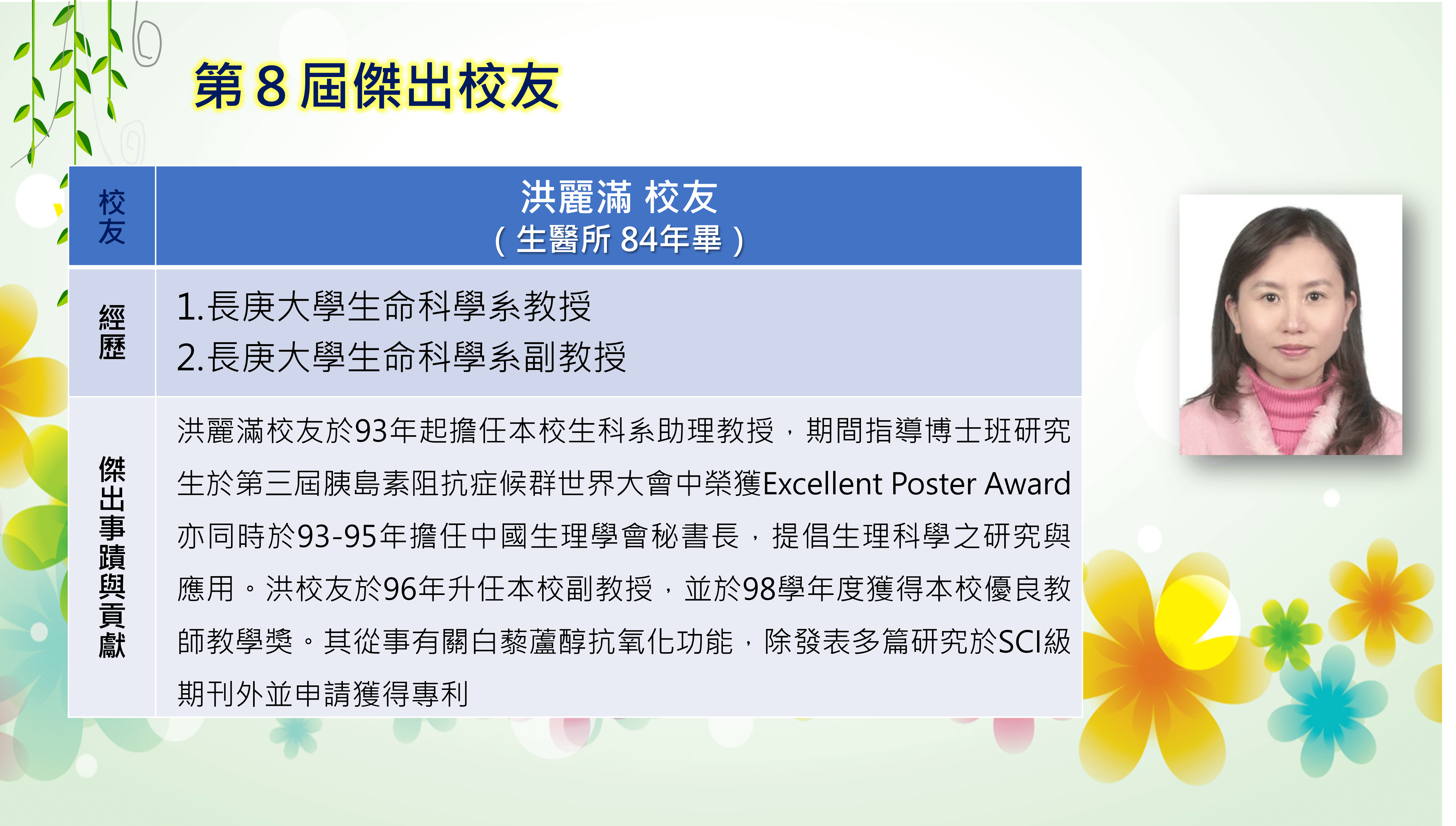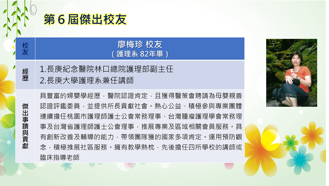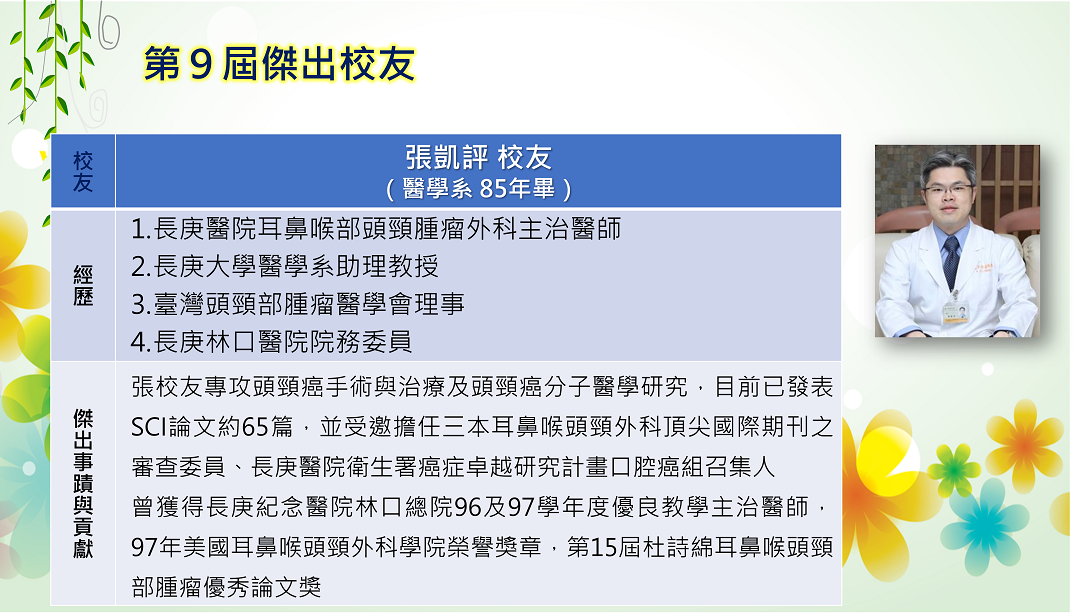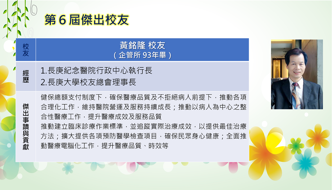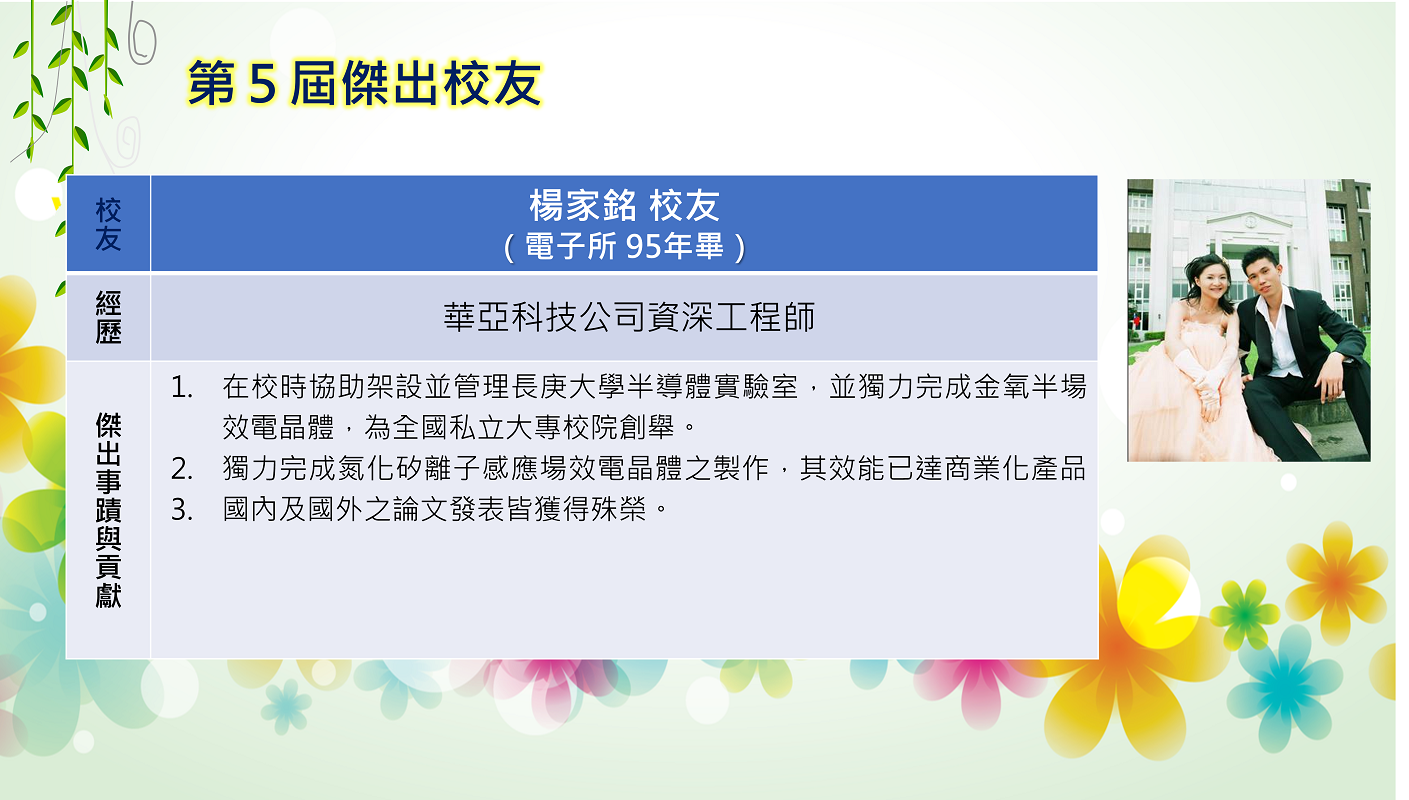 長庚大學創校三十餘年,本校畢業學子不論投入社會服務或繼續深造,都學以致用,充分發揮其所長,而且他們服務的熱誠與精神也多受到服務單位的肯定與歡迎,實踐了本校培育優秀專業人才貢獻社會的目標,為弘揚校譽,以樹立校友楷模,並激勵在校學生發揚長庚之光。