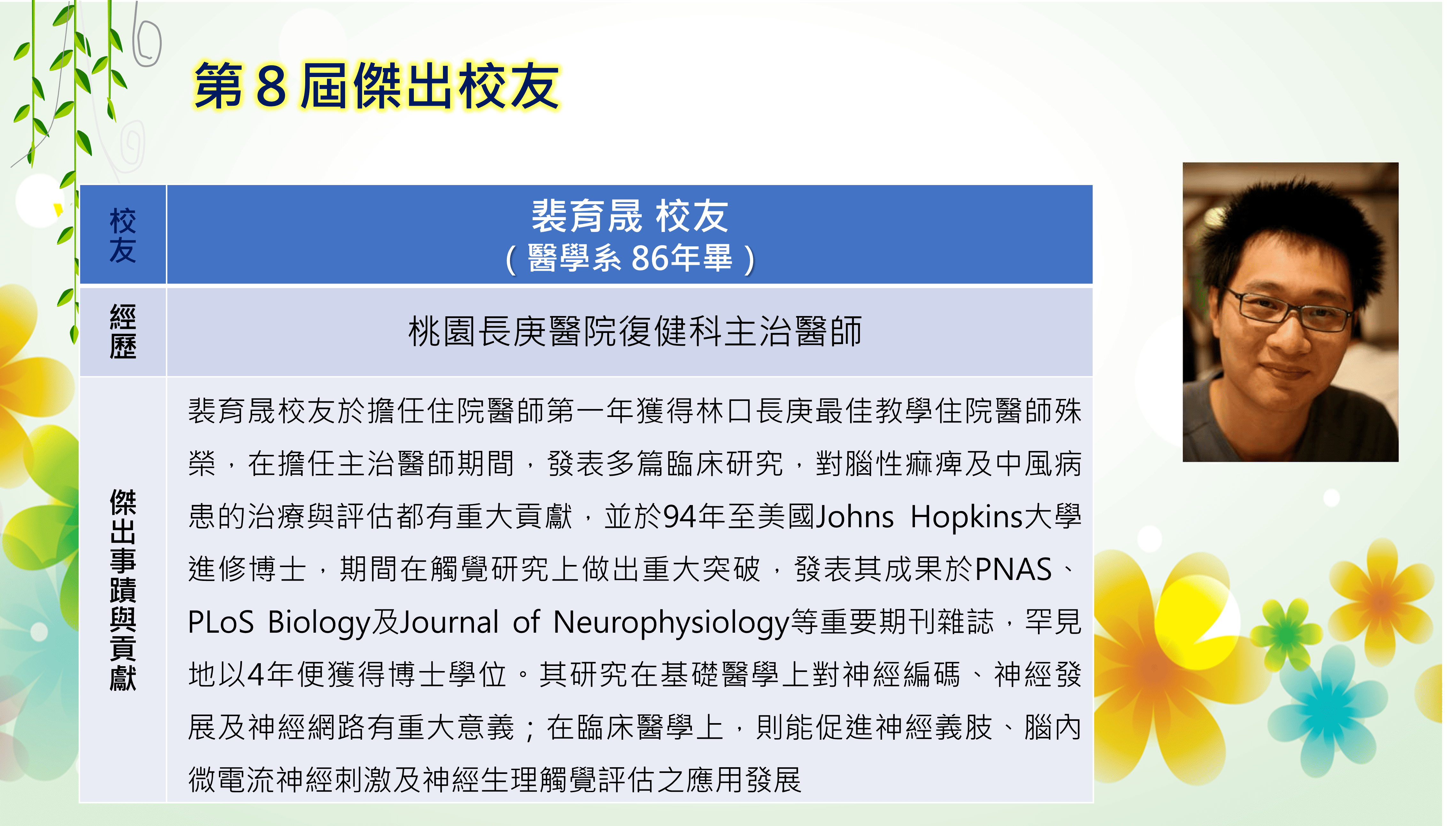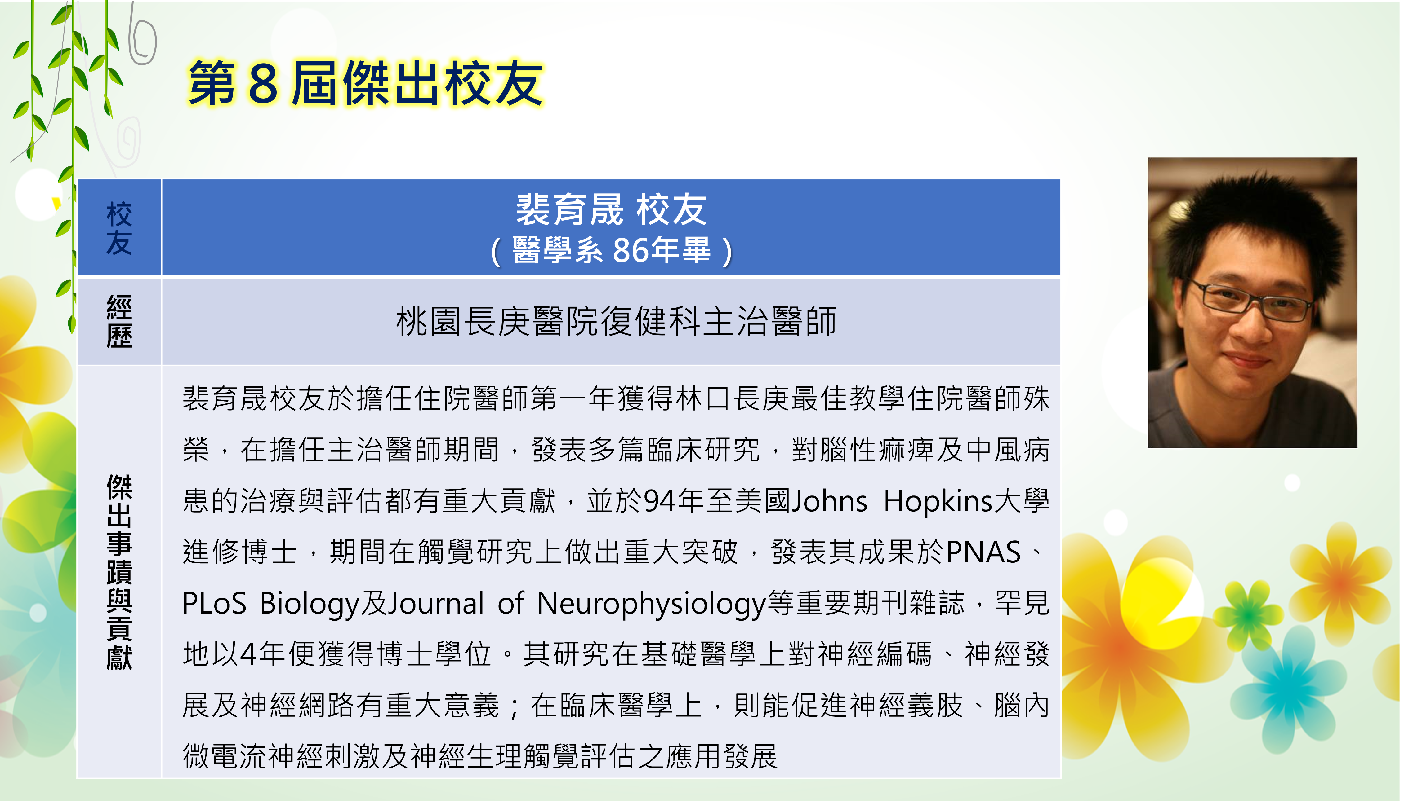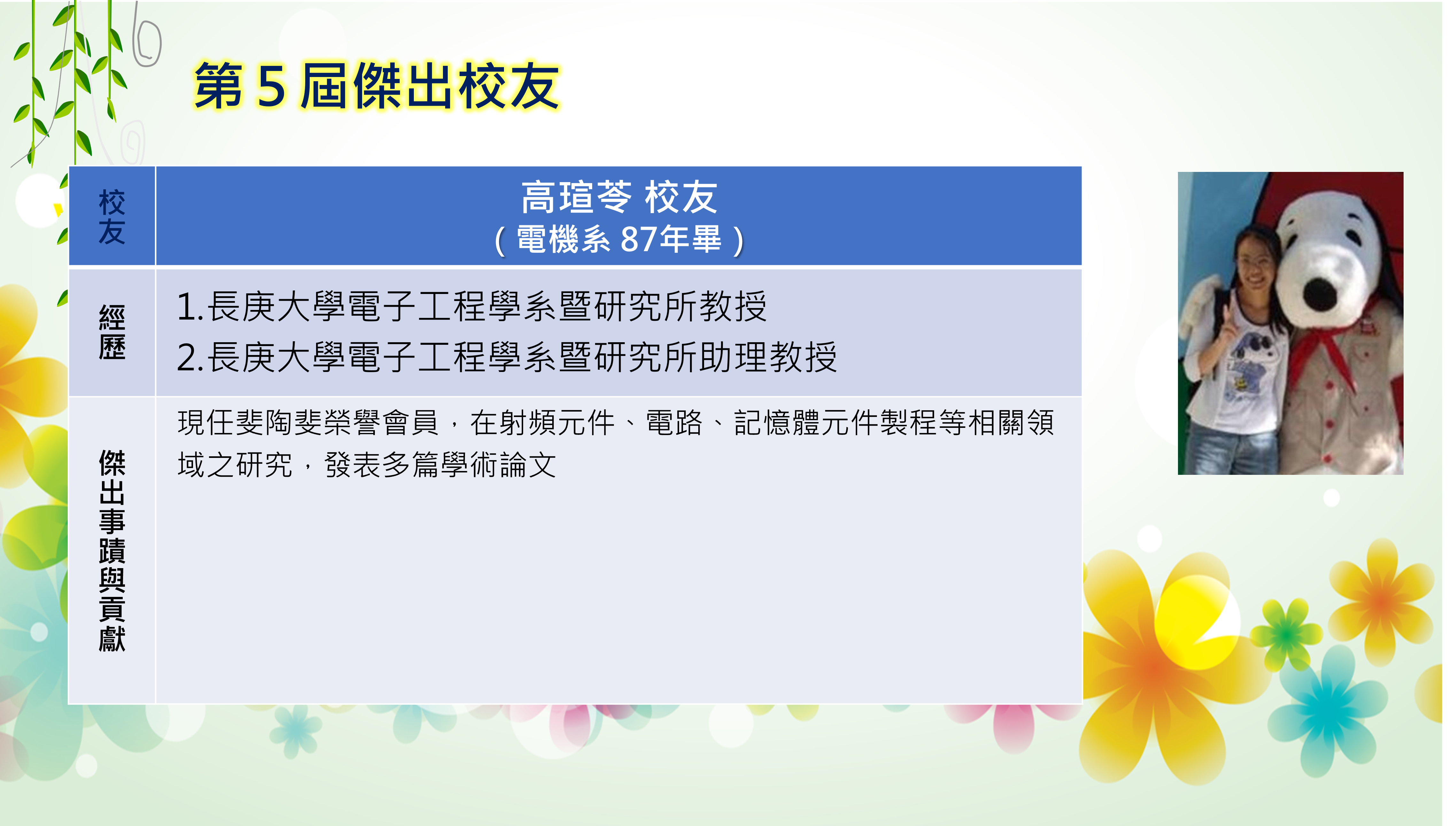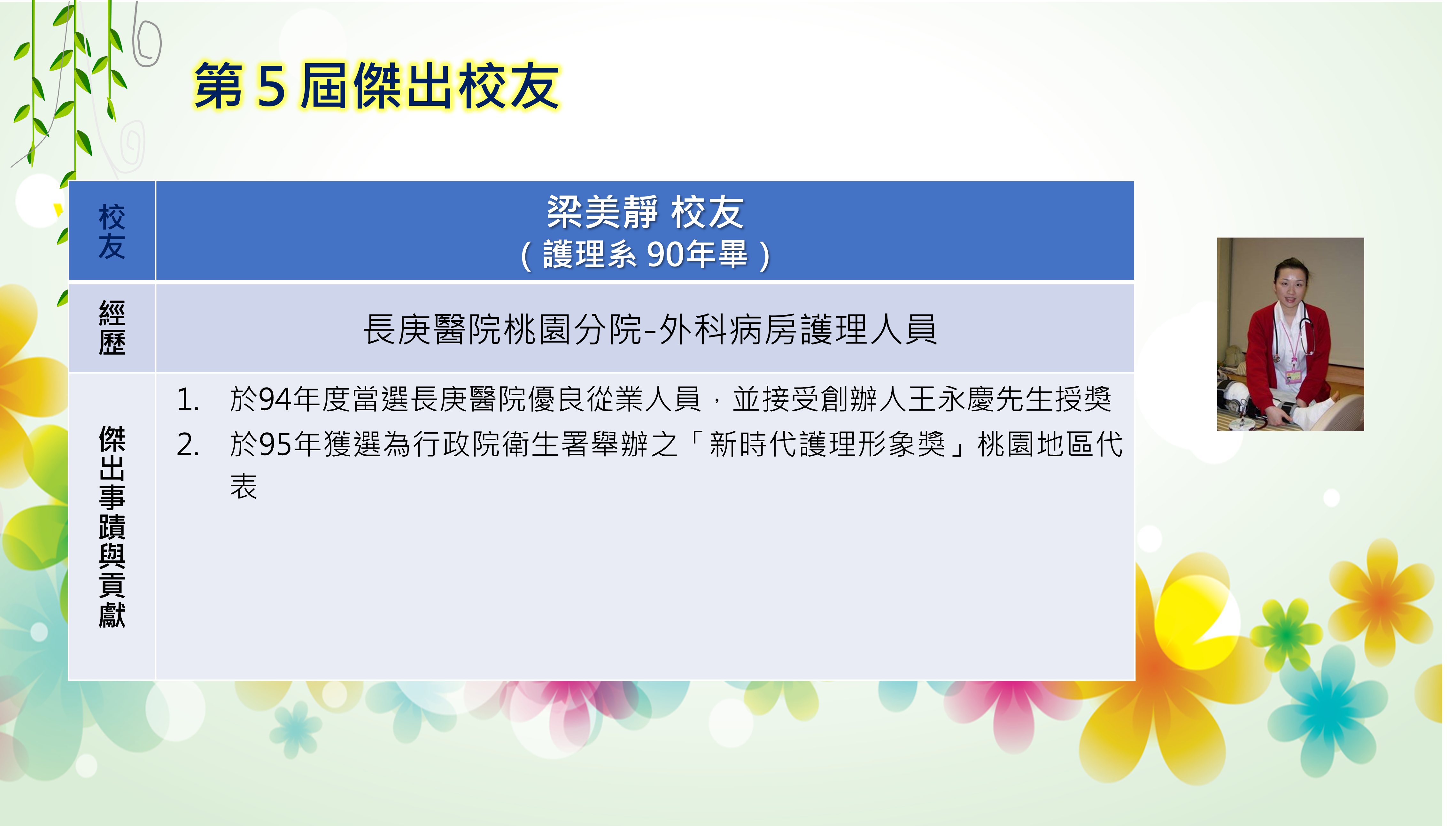 長庚大學創校三十餘年,本校畢業學子不論投入社會服務或繼續深造,都學以致用,充分發揮其所長,而且他們服務的熱誠與精神也多受到服務單位的肯定與歡迎,實踐了本校培育優秀專業人才貢獻社會的目標,為弘揚校譽,以樹立校友楷模,並激勵在校學生發揚長庚之光。