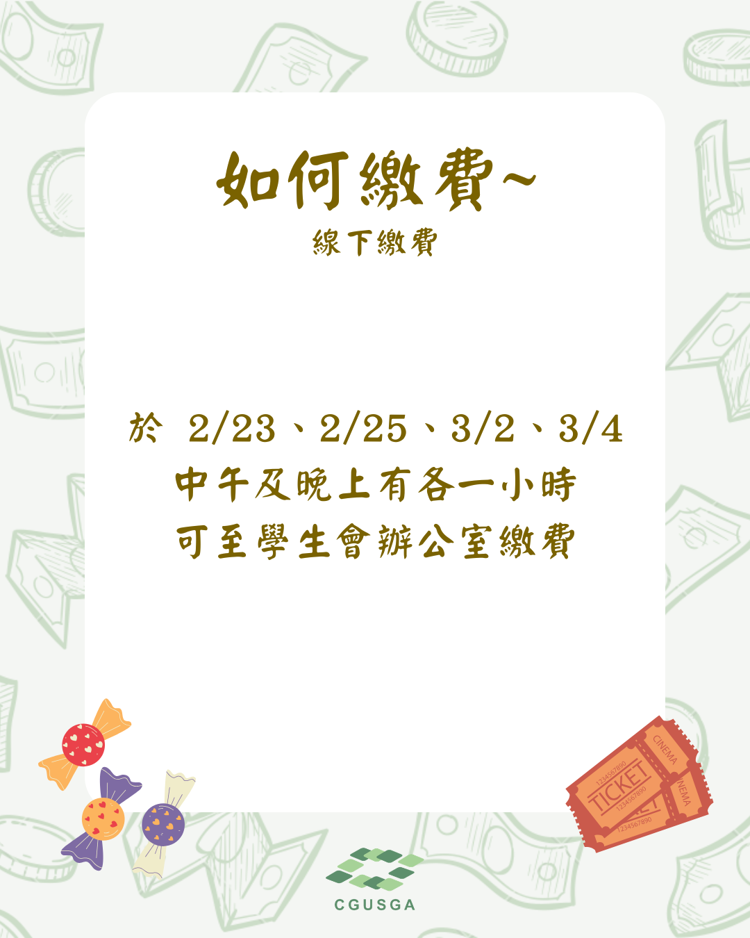 線下:2/23、2/25、3/2、3/4的中午及傍晚在學生會會辦皆可繳費!!