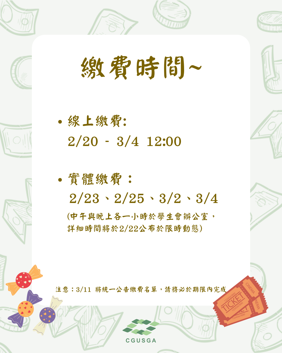 ❷實體繳費:2/23、2/25、3/2、3/4至學生會辦繳費