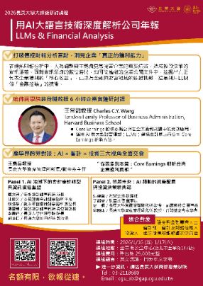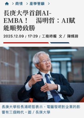 長庚大學管理學院於115學年將正式推出 AI-EMBA,延攬前台大政大EMBA名師,以結合理論、實務與AI,協助企業培養能真正掌握 AI、應用 AI、並能駕馭 AI 創造價值的高階管理人才,而學費只有台大EMBA的三分之一。當天說明會將介紹高階商務與經管組、醫務與健康產業管理組、資訊與科技管理組共同必修AI核心課程、各組特色課程及AI-EMBA報名相關資訊,招生說明會另備有免費餐盒,誠摯邀請有興趣進修的同仁踴躍參加,了解長庚大學AI EMBA課程特色與報考細節,謝謝!