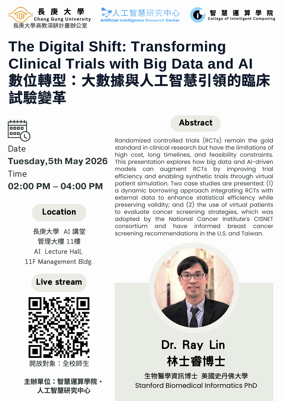 本演講將分享兩個案例研究:(1) 提出一種創新的「動態借用」(Dynamic borrowing)方法,整合外部數據以提升研究效率,同時極小化選擇偏差並維持試驗的可信度;(2) 運用虛擬病患與合成臨床試驗評估癌症篩檢計畫的成效。相關研究結果已納入美國國家癌症研究所(NCI)的癌症干預及監測模型網路(CISNET),並實質影響了美國與台灣的乳癌篩檢建議指引。