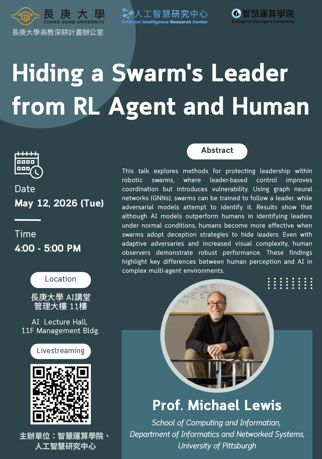 Michael Lewis 教授為美國匹茲堡大學(University of Pittsburgh)資訊學院教授,專長於人機互動、人機協作與群體機器人(swarm robotics)研究,特別關注人類如何與多機器人系統及AI協同運作。其研究涵蓋人因工程、強化學習、人機信任與決策支援等領域,長期獲美國國防高等研究計畫署(DARPA)與多個政府機構支持,為人機協作與智慧系統領域的重要學者。