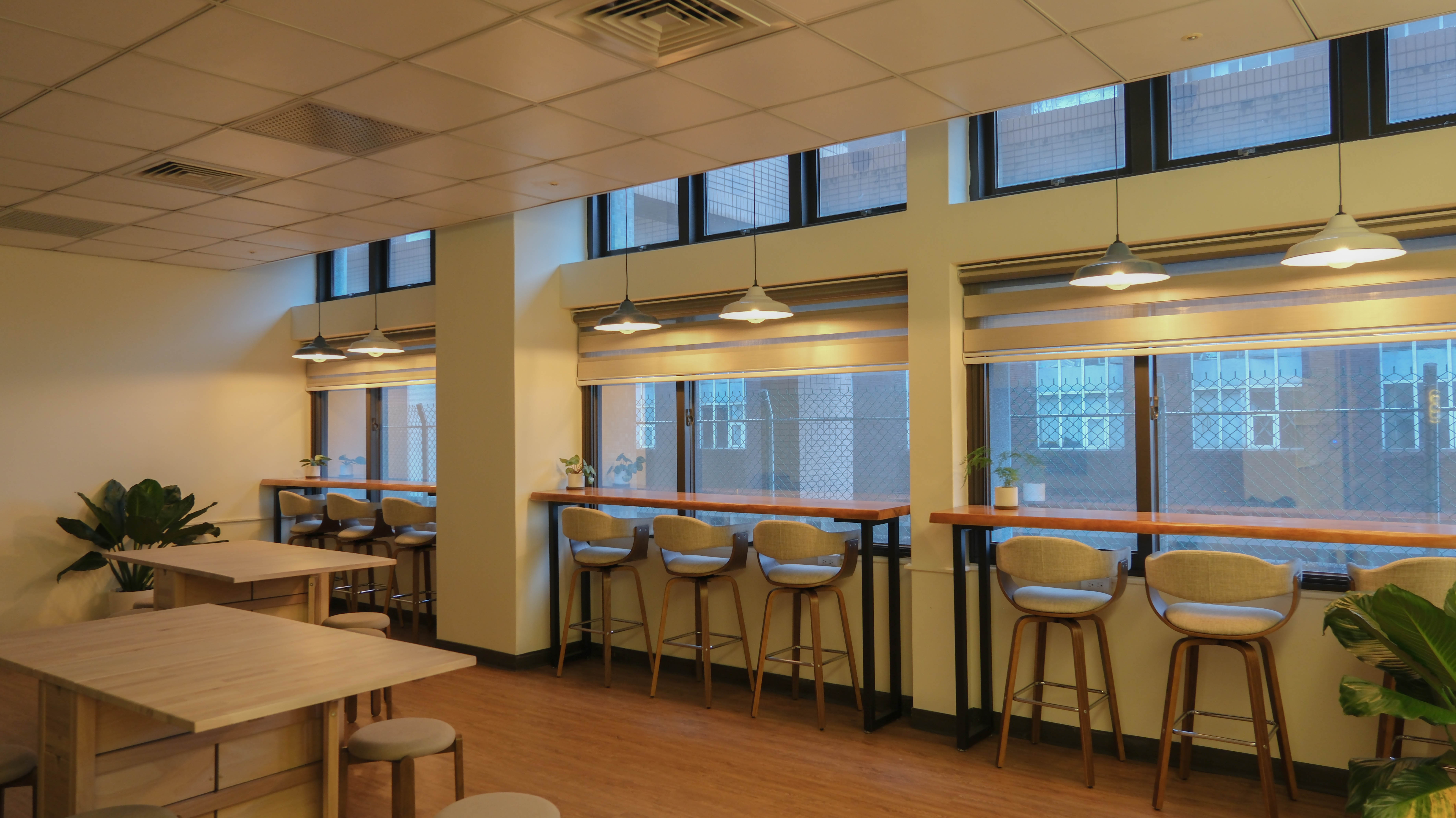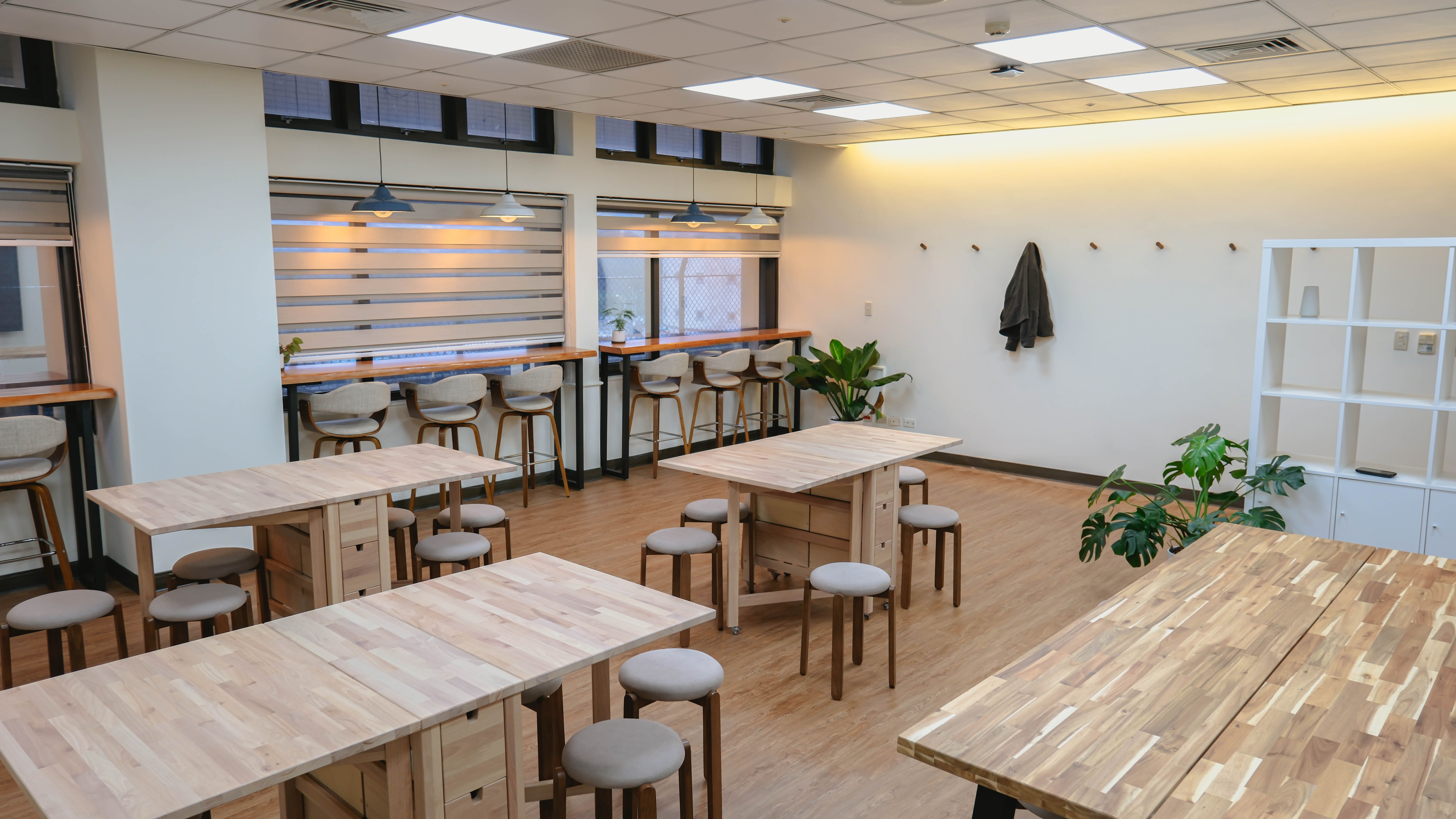 此外,教室一側設有窗邊高腳座位區,搭配自然採光與柔和照明,營造舒適且具靈感的學習氛圍,適合學生自主學習、專題討論或短暫交流。整體空間並搭配綠植與簡約設計,提升環境品質與使用體驗。