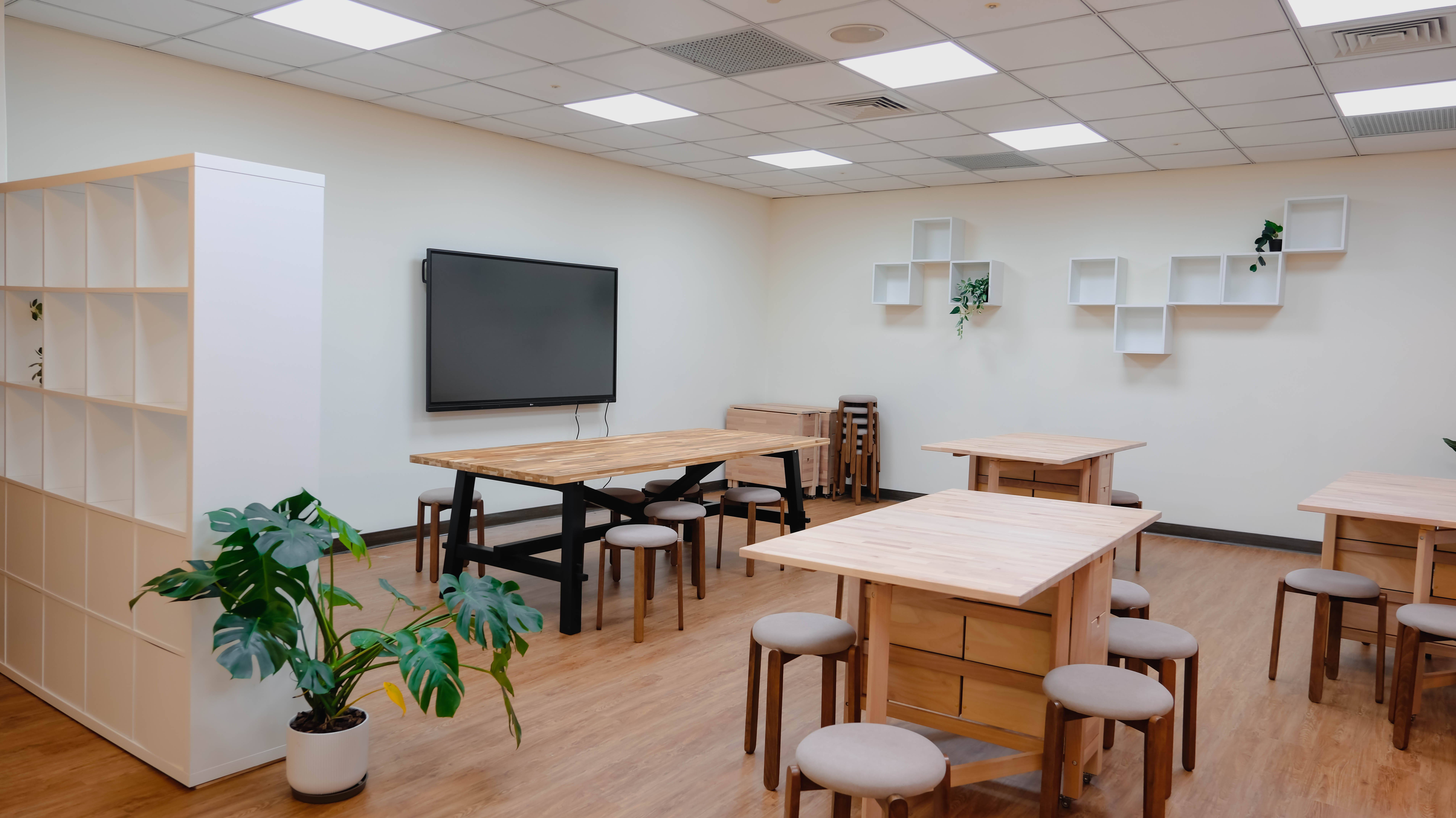 教室內採開放式設計,配置多組木質討論桌與舒適座椅,可靈活進行分組討論、小組教學及工作坊活動,促進互動式學習與創意思考。空間同時設有大型顯示螢幕,方便進行簡報展示與即時教學,提升課堂效率。