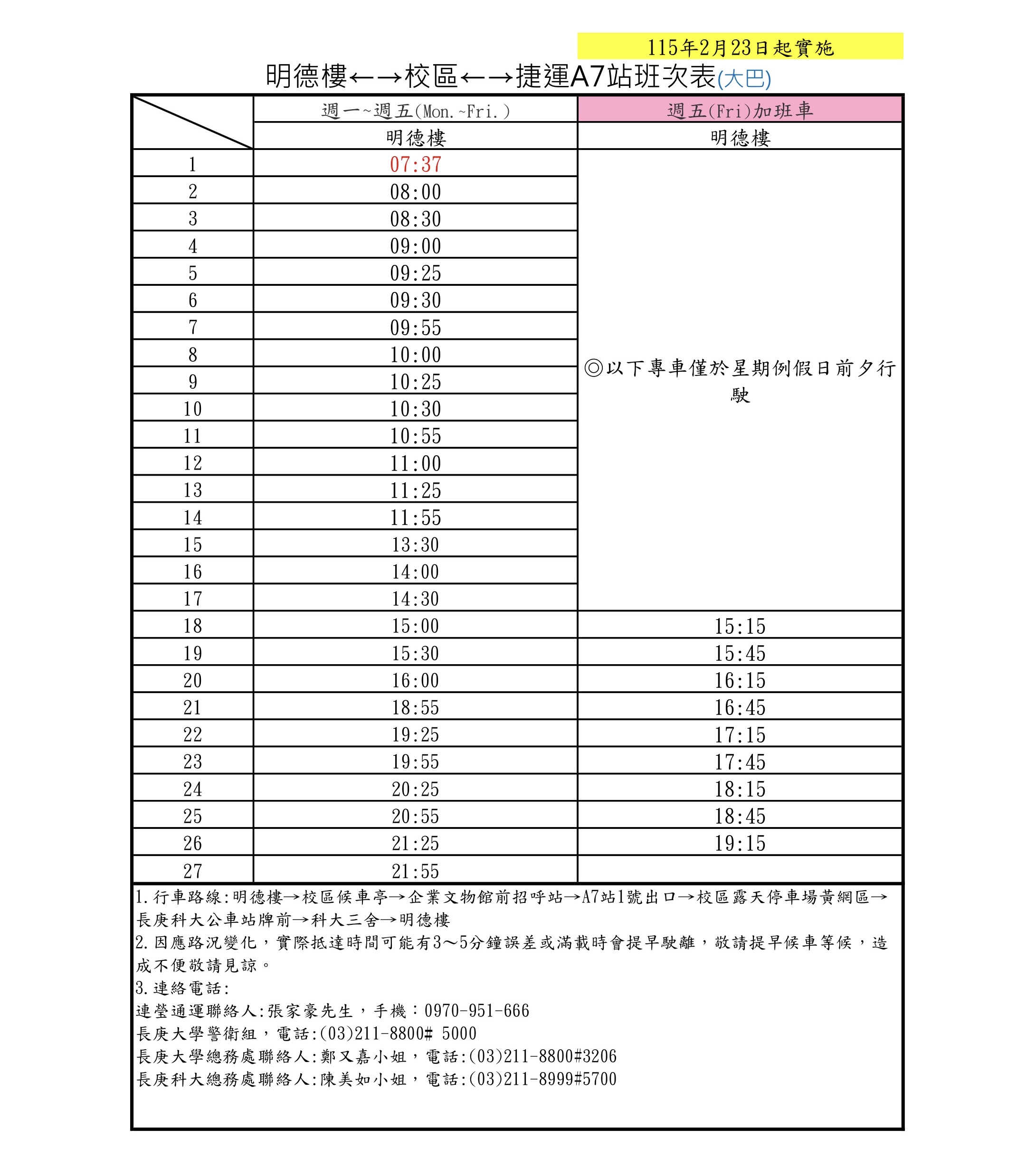 - 接駁車:出口左側停放uBike附近搭乘校區接駁車(家豪大巴)至長庚大學候車亭下車(可參考接駁車時刻表)