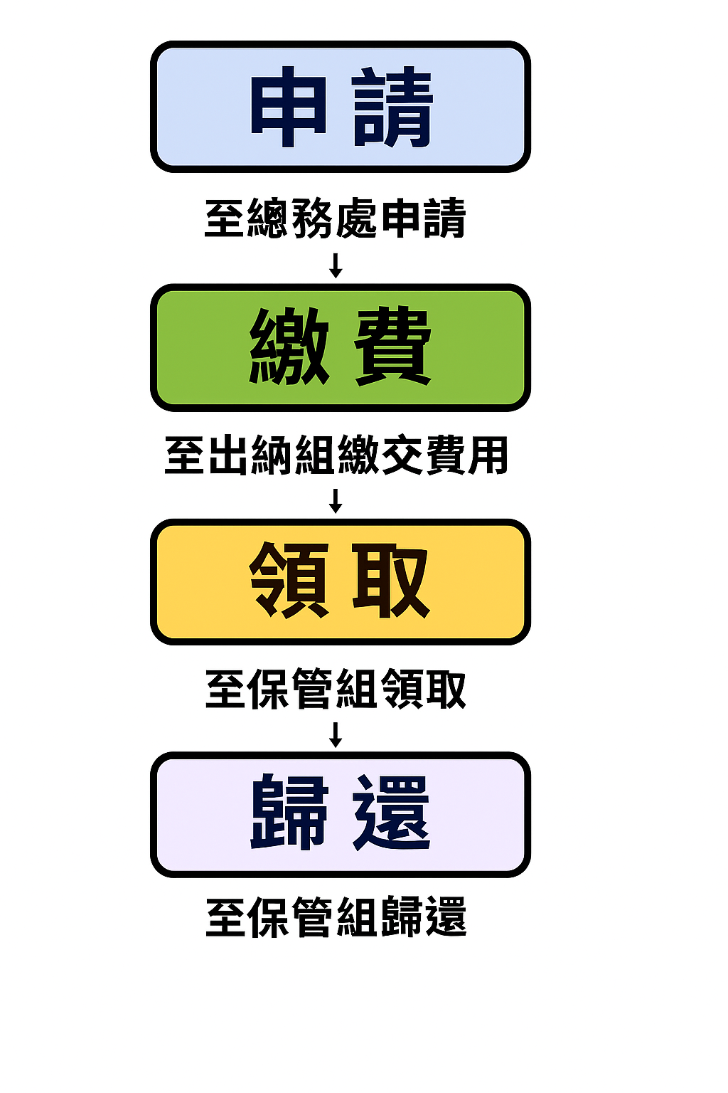 1.本校師生、校友:歸還日前上班時段歸還總務處保管組。