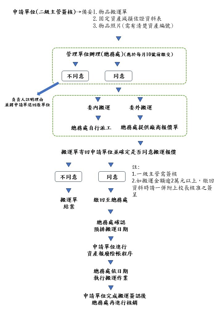 3.後續總務處負責人會與申請單位確認預排搬運日期,有帳物品須請申請單位事先完成資產報廢除帳程序才可進行搬運。