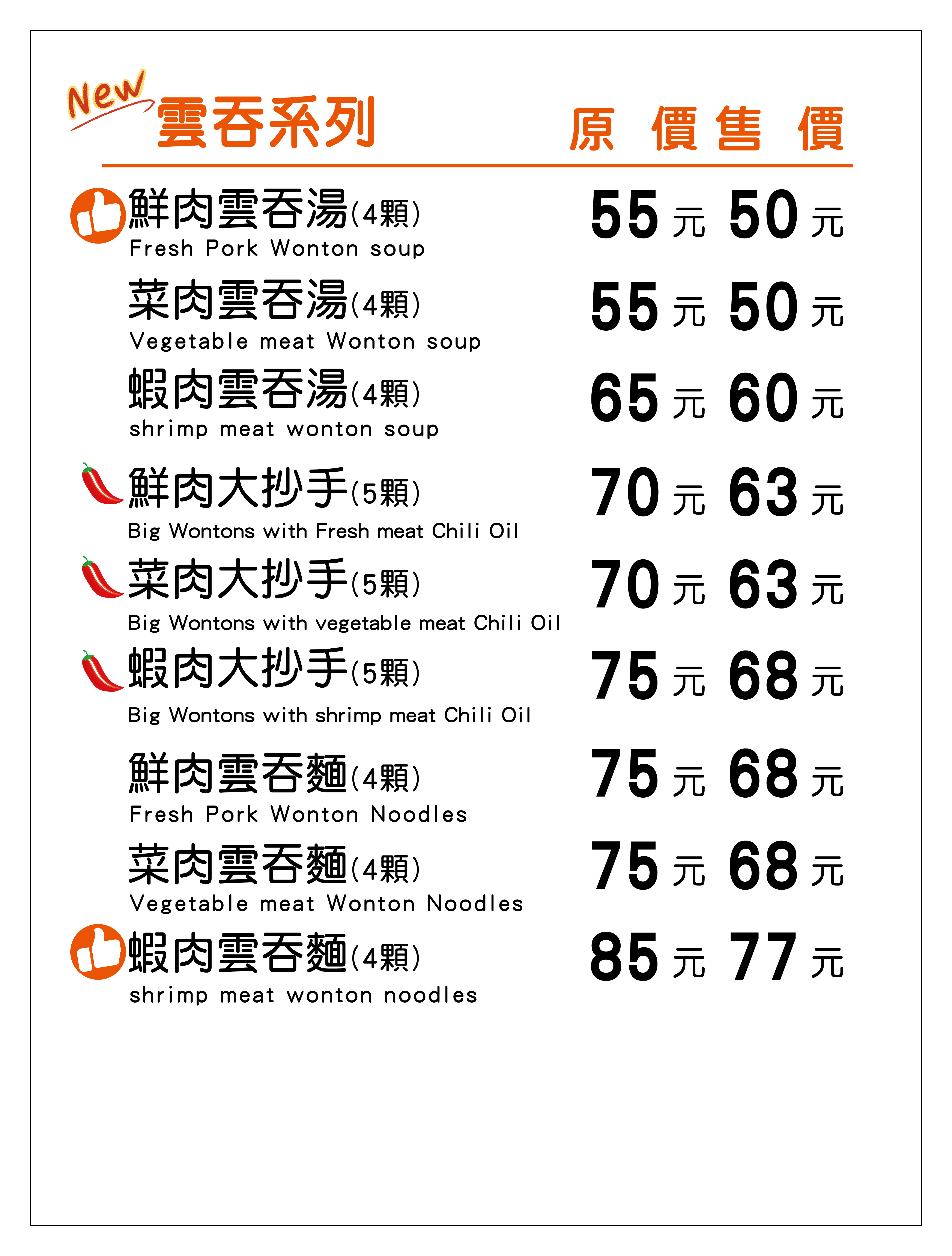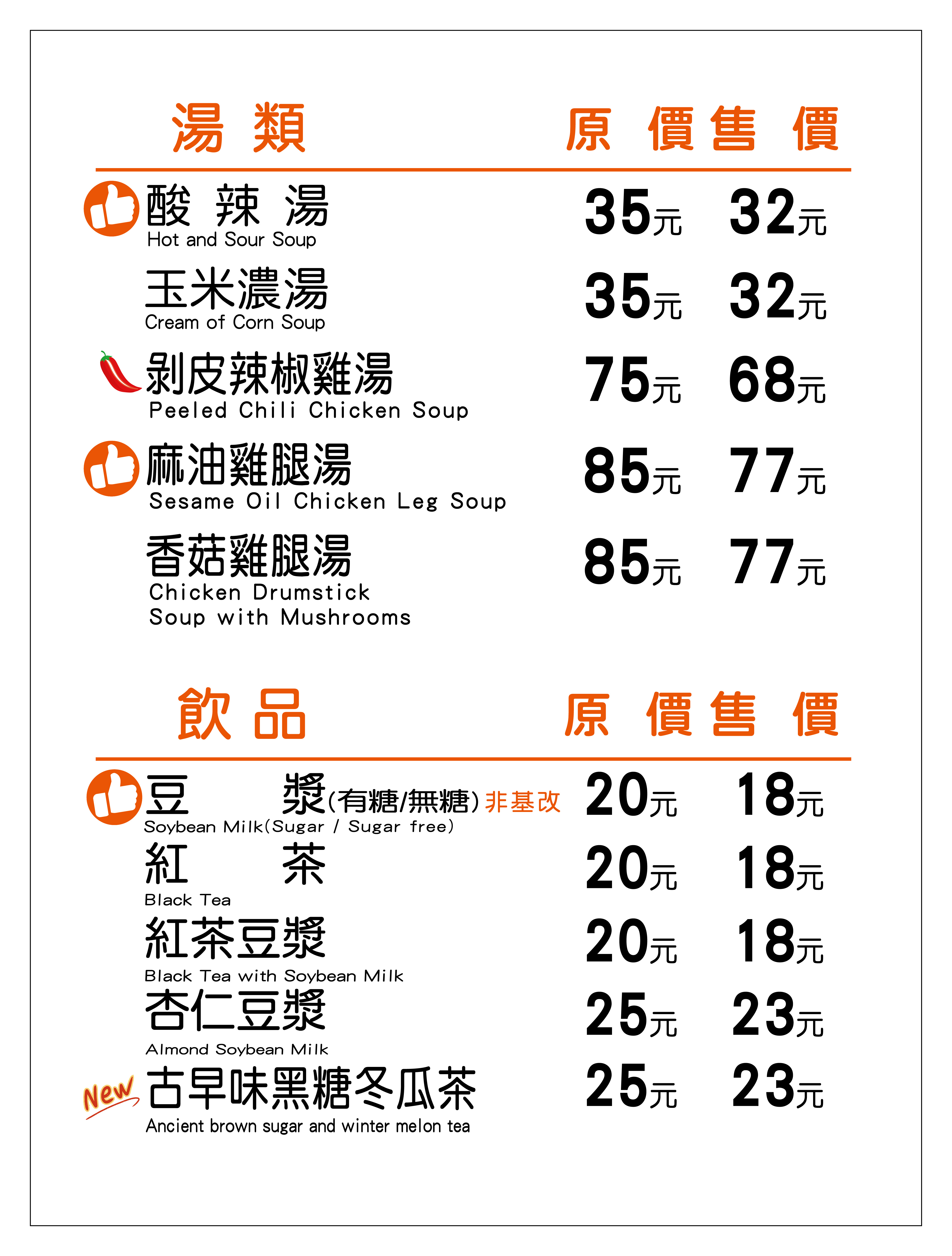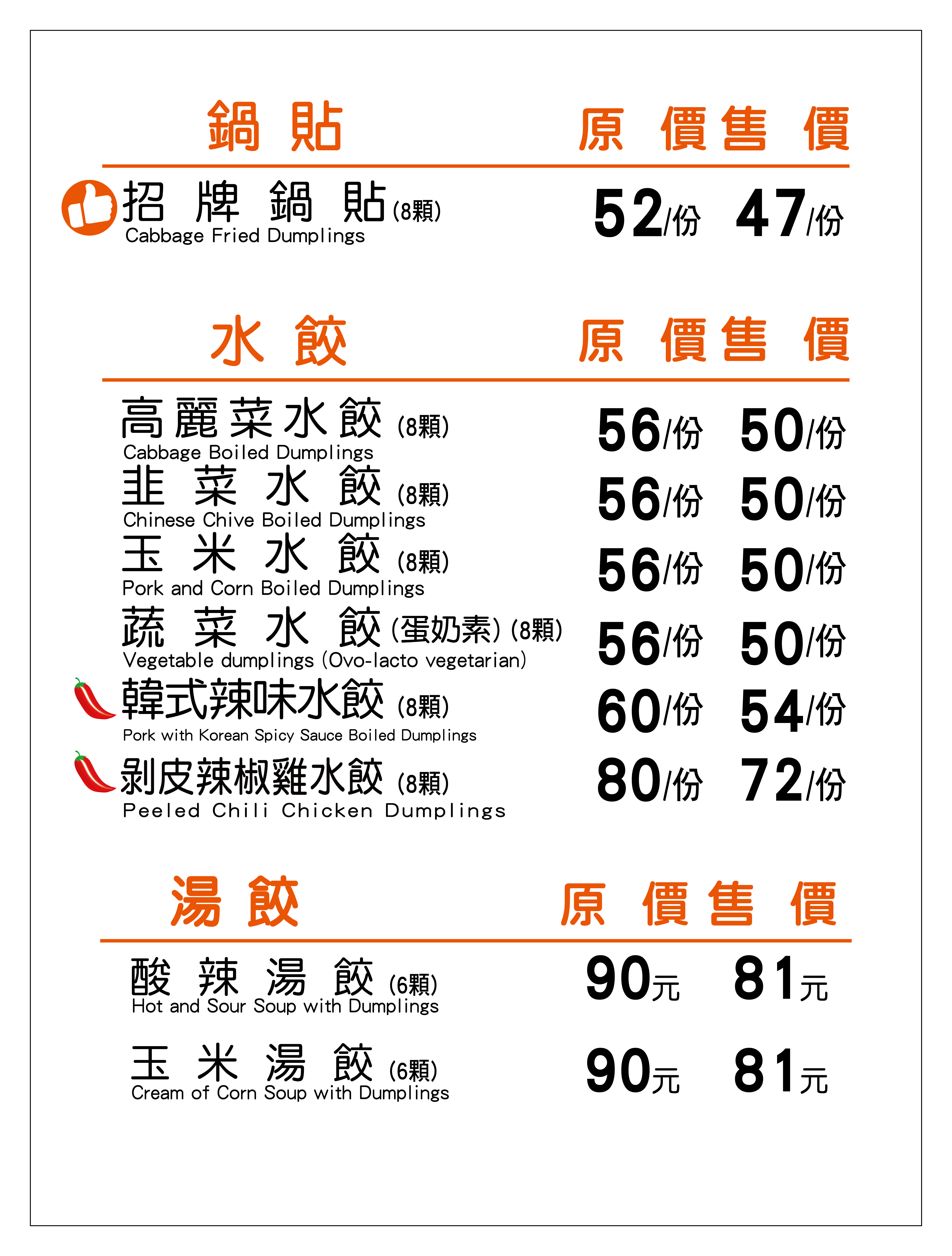 品項:水餃、鍋貼、麵食、湯品類