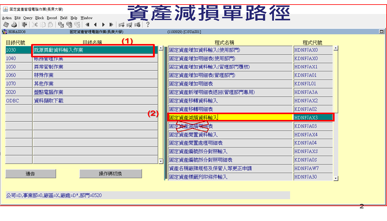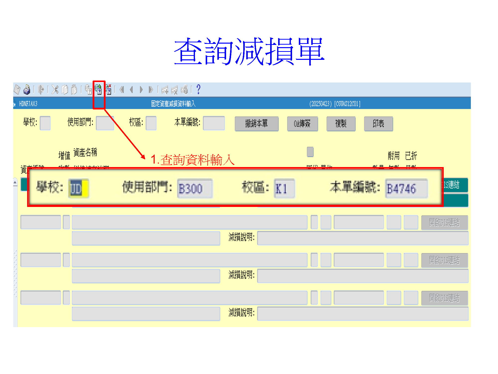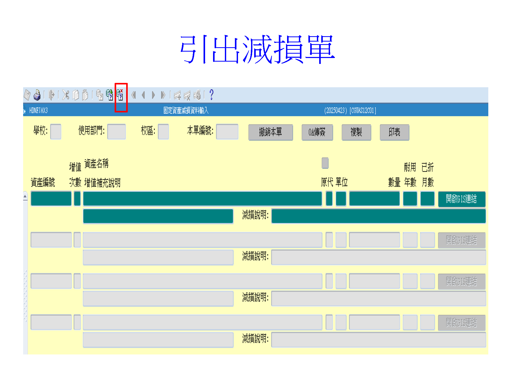 一、申請單位先進入ERP系統輸入「減損單」並存成PDF檔(附件一),及附加於簽呈內核簽(申請單位→總務處→校長室)。