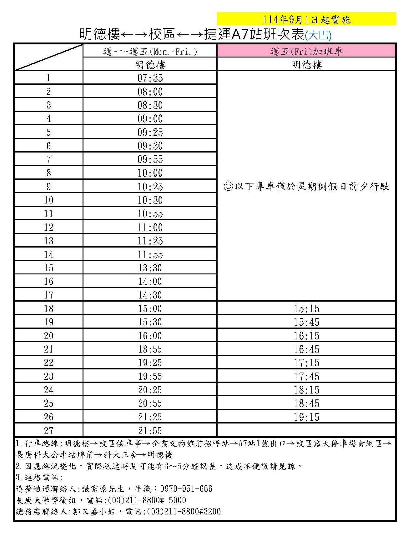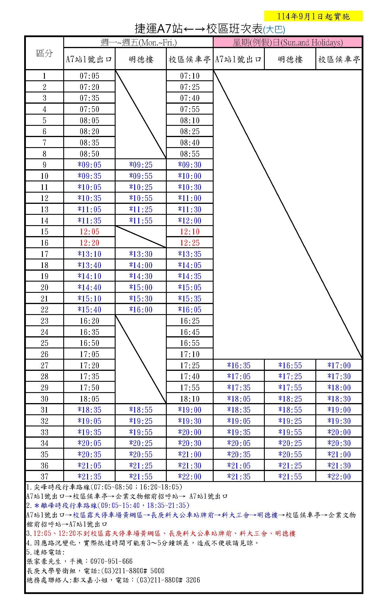 自9月1日起校區往返A7捷運站接駁車時刻,請查照。