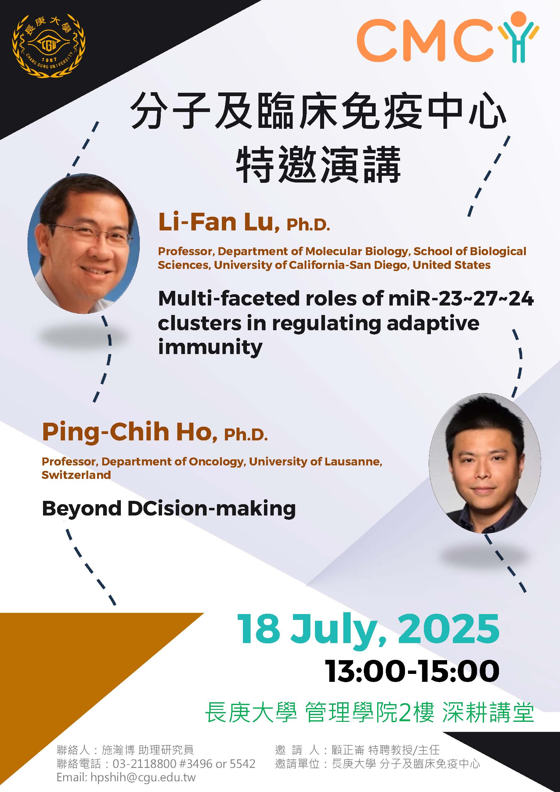 1.Title: 「Multi-faceted roles of miR-23~27~24 clusters in regulating adaptive immunity」by Li-Fan Lu, Ph.D.、「Beyond DCision-making」by Ping-Chih Ho, Ph.D.