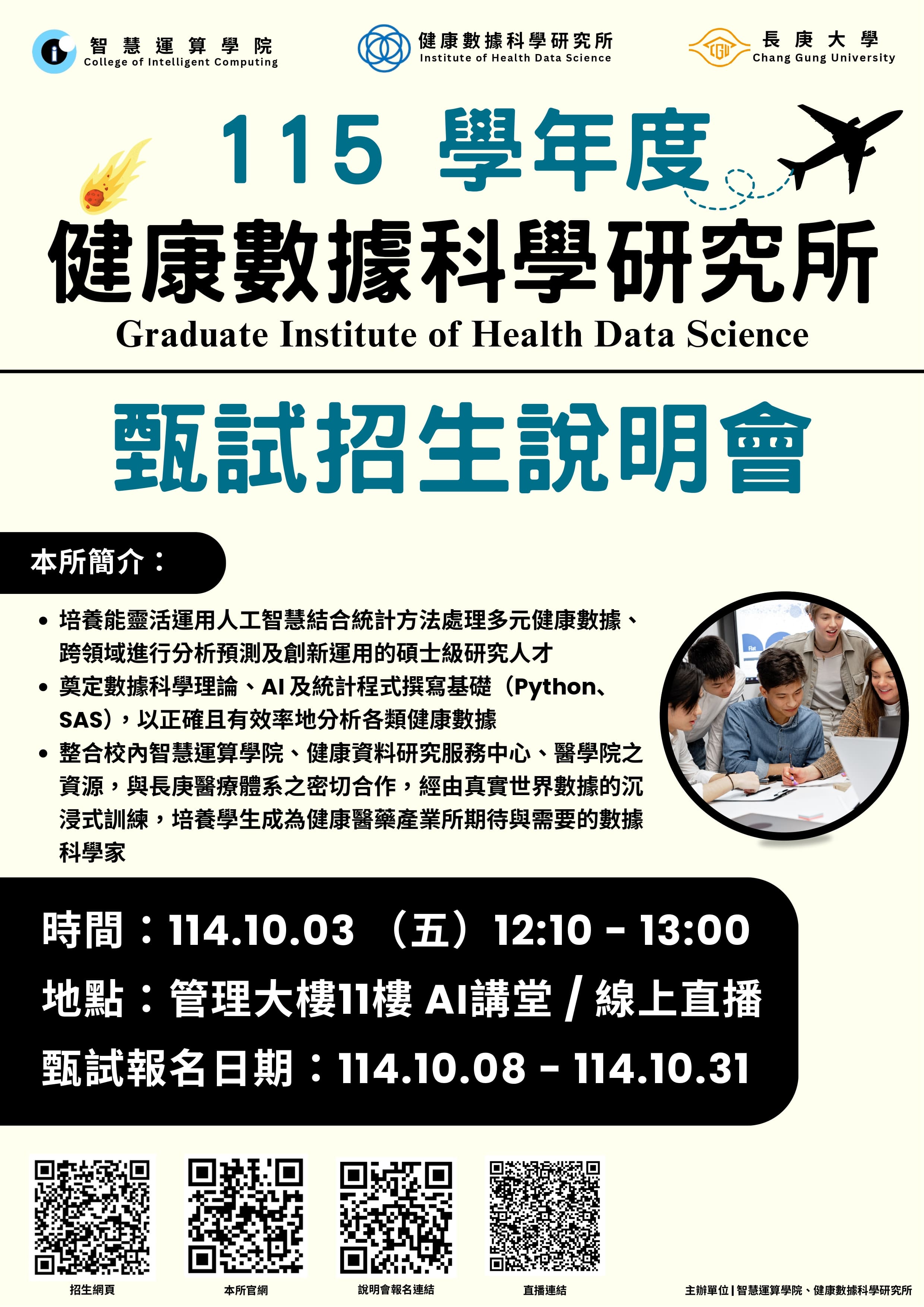 健康數據科學研究所致力於培養能靈活運用人工智慧結合統計方法處理多元健康數據、進行跨領域分析與創新應用的碩士級研究人才。本次說明會將介紹本所課程特色、資源整合及與長庚醫療體系合作的優勢,並說明甄試入學相關資訊。
