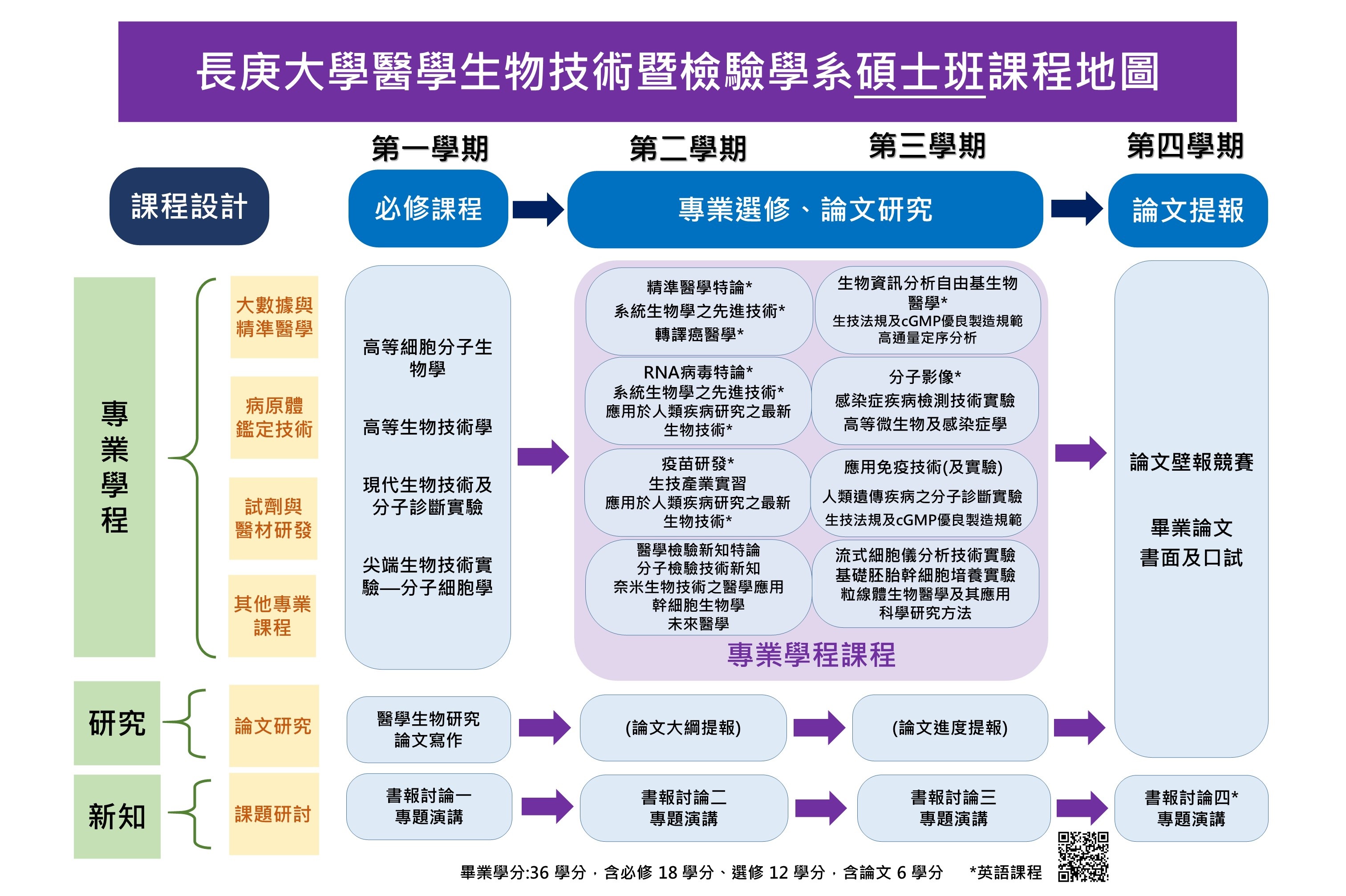 碩士班課程秉持理論與實際並重的原則,重視實驗與實做。核心必修課程有高等細胞生物學(理論),培養學生紮實的基礎知識,以及高等生物技術(理論),現代生物技術及分子診斷(實驗)和尖端生物技術—分子細胞學(實驗),培養學生基本的醫學生物技術研究能力。選修課程則分為四大領域,分別是轉譯癌症醫學暨分子檢驗、預防醫學檢驗、感染疾病研究、檢驗試劑研發等,均是目前醫學生物技術的主流,學生可依據自己的興趣選擇一到兩個領域鑽研。畢業前必須完成一個專業學程:「大數據與精準醫學專業學程」、「病原體鑑定技術專業學程」、「試 劑與醫材研發專業學程」。