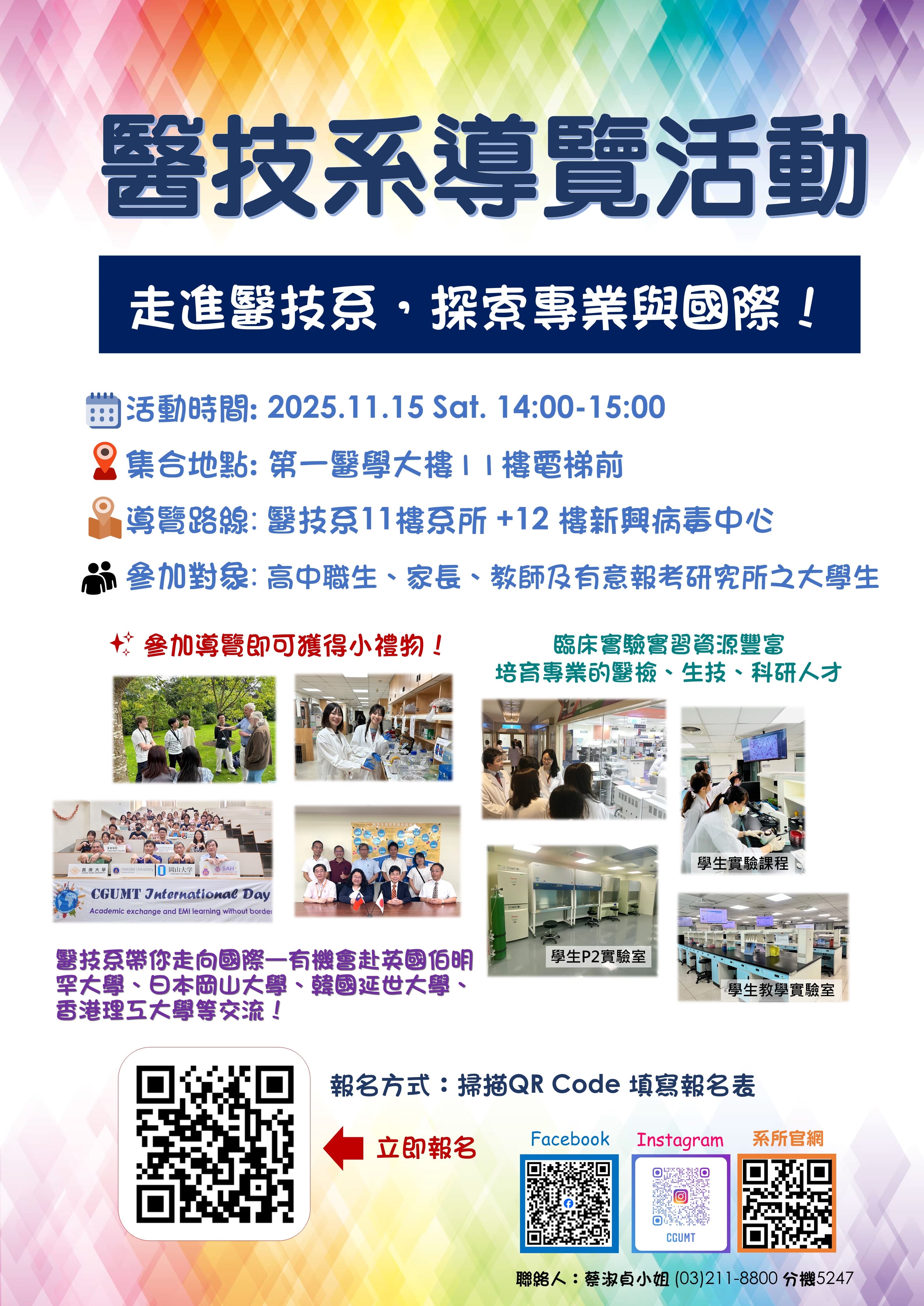 📣歡迎來參加醫技系導覽!! 活動時間:2025.11.15 Sat. 14:00-15:00 集合地點:第一醫學大樓11樓電梯前 導覽路線:醫技系11樓系所+12樓新興病毒中心 參加對象:高中職生、家長、教師及有意報考研究所之大學生