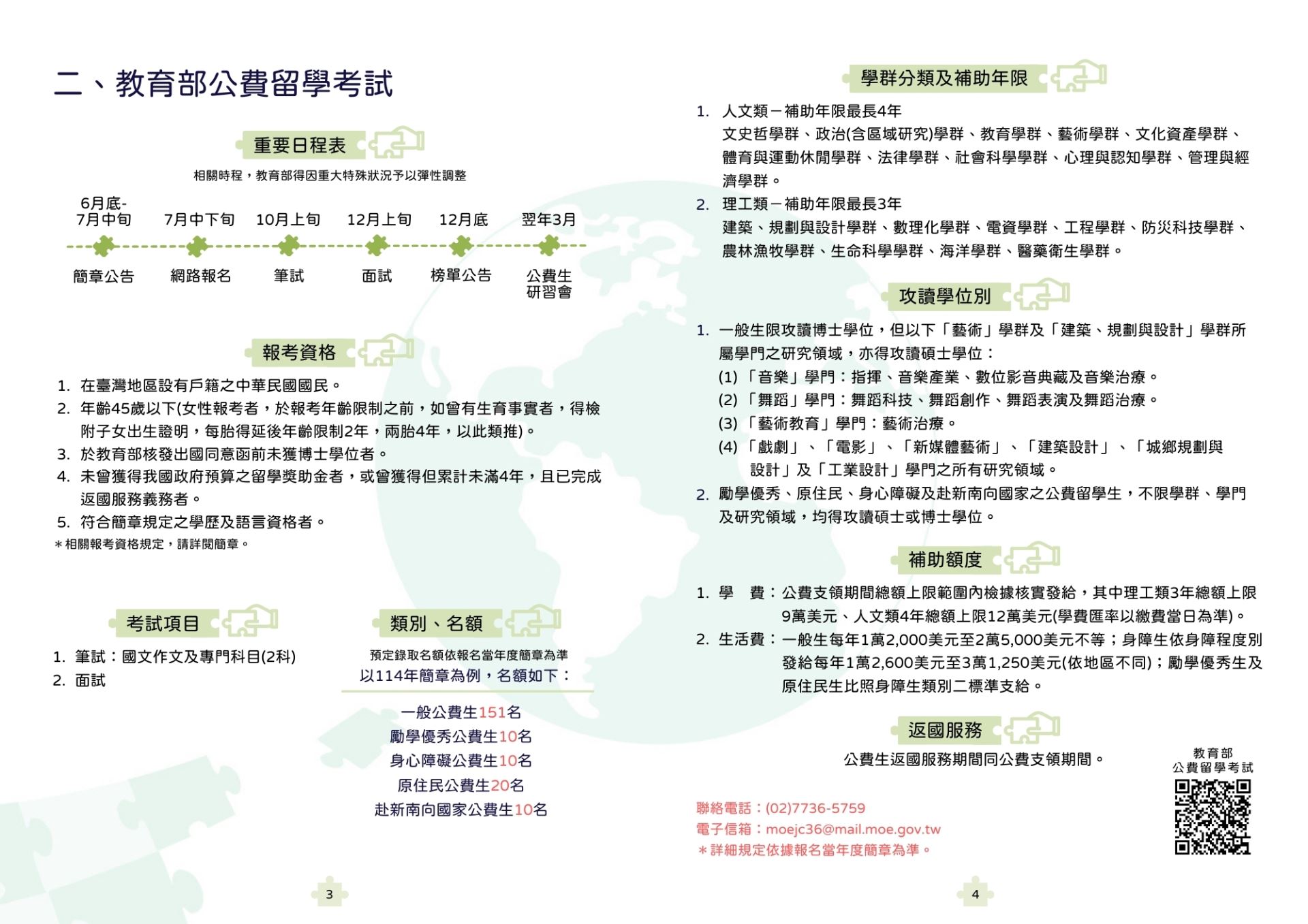 為培育我國高階專業人才布局海外,並拓展青年學子國際宏觀視野及強化專業知能,教育部提供公費留學考試獎學金,歡迎有意願出國留學學生踴躍報名。一、整體流程
