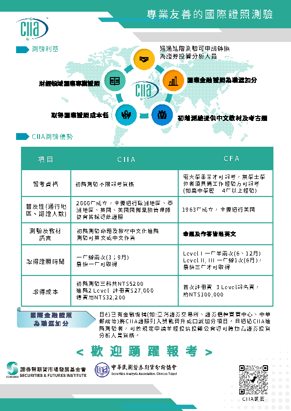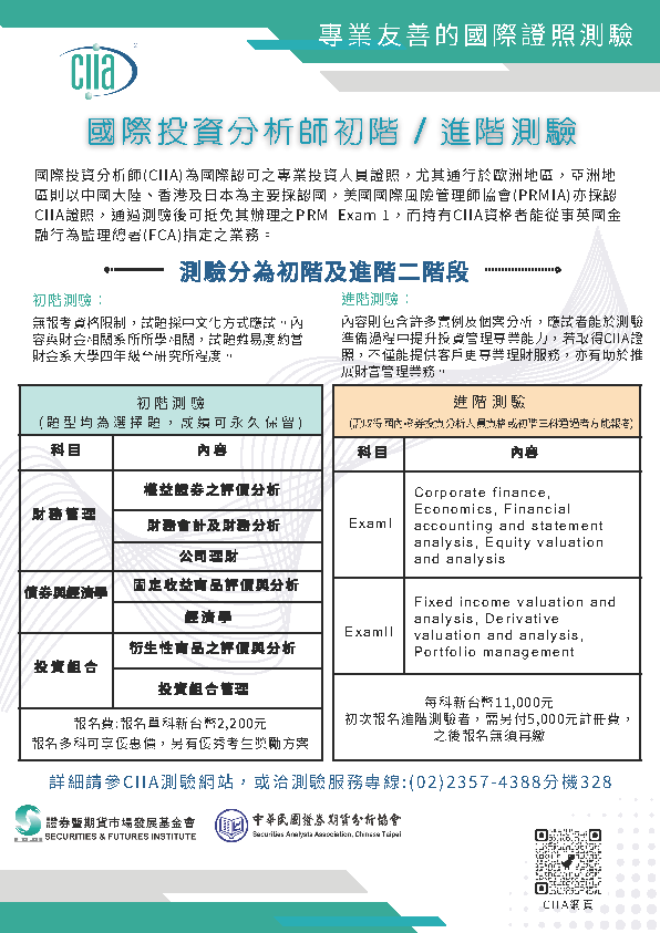 考試內容,亦歡迎至本基金會網站(https://www.sfi.org.tw/)「測驗及招募/國際證照/國際投資分析師(CIIA) 專區」查詢相關訊息。